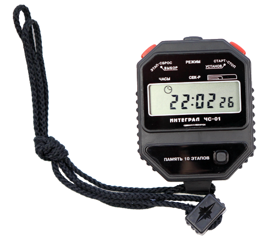 Часы-секундомер электронные "Интеграл ЧС-01" - электронный прибор с автономным источником питания и жидкокристаллическим индикатором (ЖКИ). Принцип работы часов-секундомера электронных основан на использовании кварцевого генератора и микропроцессора, обеспечивающего работу прибора во всех режимах и вывод измерительной информации на ЖКИ. Часы-секундомер электронные "Интеграл ЧС-01" предназначены для применения в учебной деятельности, быту, при занятиях физической культурой и в других сферах, в которых не требуется высокая точность измерений интервалов времени. Прибор обеспечивает работу в двух режимах – «секундомер» и «часы». Выбор режима и управление в каждом режиме осуществляется соответствующими кнопками. В режиме «секундомер» возможно занесение результатов измерений в память (максимальное число измерений – 10), считывание и стирание результатов измерений. В режиме «часы» осуществляется отображение текущего времени по двадцати четырех часовой шкале в часах, минутах и секундах.
